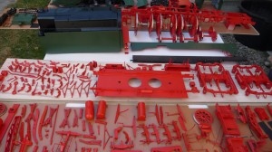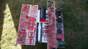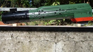 Inzwischen sind die Lackierarbeiten beendet. Rot und schwarz ließen sich einwandfrei aufbringen, das Chromoxidgrün (RAL 6020) dagegen wollte nicht so recht decken. Grundiert wurde in weiß.