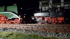 Kurzer Zwischenhalt bei Nacht auf der Modulanlage der IG Spur II beim Jahrestreffen 2012. Auf dem Nachbargleis steht die gesuperte V100 047 von Torsten Schöning aus Dresden.